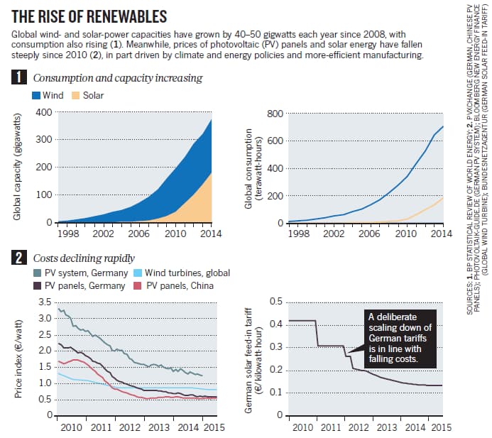 In our view, the best hope of ending this logjam rests with tuning policies to drive down the cost of renewable power sources even further and faster than in the past five years. The cost of crystalline silicon photovoltaic (PV) modules has fallen by 99% since 1978 and by 80% since 2008; installation costs for wind power have also dropped, and solar and wind capacity has grown [...]. Prices will continue to fall, but — without more help — the decrease will not be fast enough to make a dent in the climate problem.