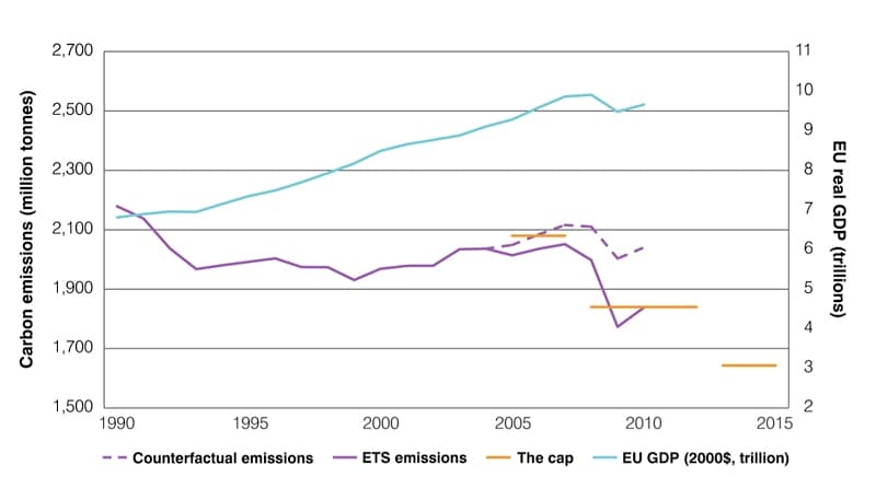 Even assuming an emissions growth rate that is 1 percent less than the growth in GDP (represented by the dotted “counterfactual” line, which estimates what emissions would have been from 2005 to 2010 without the introduction of the EU’s Emissions Trading System), the data suggests that the system has succeeded in reducing emissions beyond what would be expected from the recession alone. (EU Emissions Data: A. Denny Ellerman/EU GDP data: World Bank)