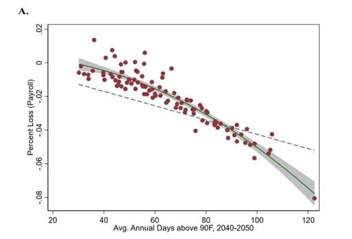 One additional day >32 °C (90 °F) lowers annual payroll by 0.04%, equal to 2.1% of average weekly earnings.