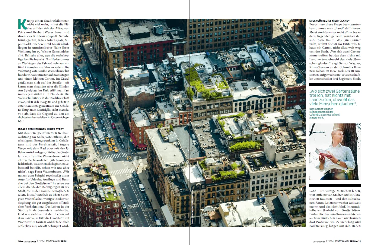 Bevor man diese Frage beantworten kann, muss man „Land“ definieren. Meist sind darunter nicht dünn besiedelte Gegenden gemeint, sondern der suburbane Raum. Wer „ins Grüne“ zieht, wohnt fortan im Einfamilienhaus mit Garten, nicht allzu weit weg von der Stadt. „Wo sich zwei Gartenzäune treffen, hat das aber nichts mit Land zu tun, obwohl das viele Menschen glauben“, sagt Gernot Wagner, Klimaökonom an der Columbia Business School in New York. Der in Amstetten aufgewachsene Wissenschaftler unterscheidet drei Regionen: Stadt, Land – wo wenige Menschen leben, weit entfernt von Städten und strukturierten Räumen – und den suburbanen Raum. Letzterer wächst weltweit enorm und das nicht bloß im unmittelbaren Umfeld von Großstädten. Einfamilienhaussiedlungen entstehen auch im ländlichen Raum und bringen dort Probleme wie Zersiedelung und Bodenversiegelungen mit sich.