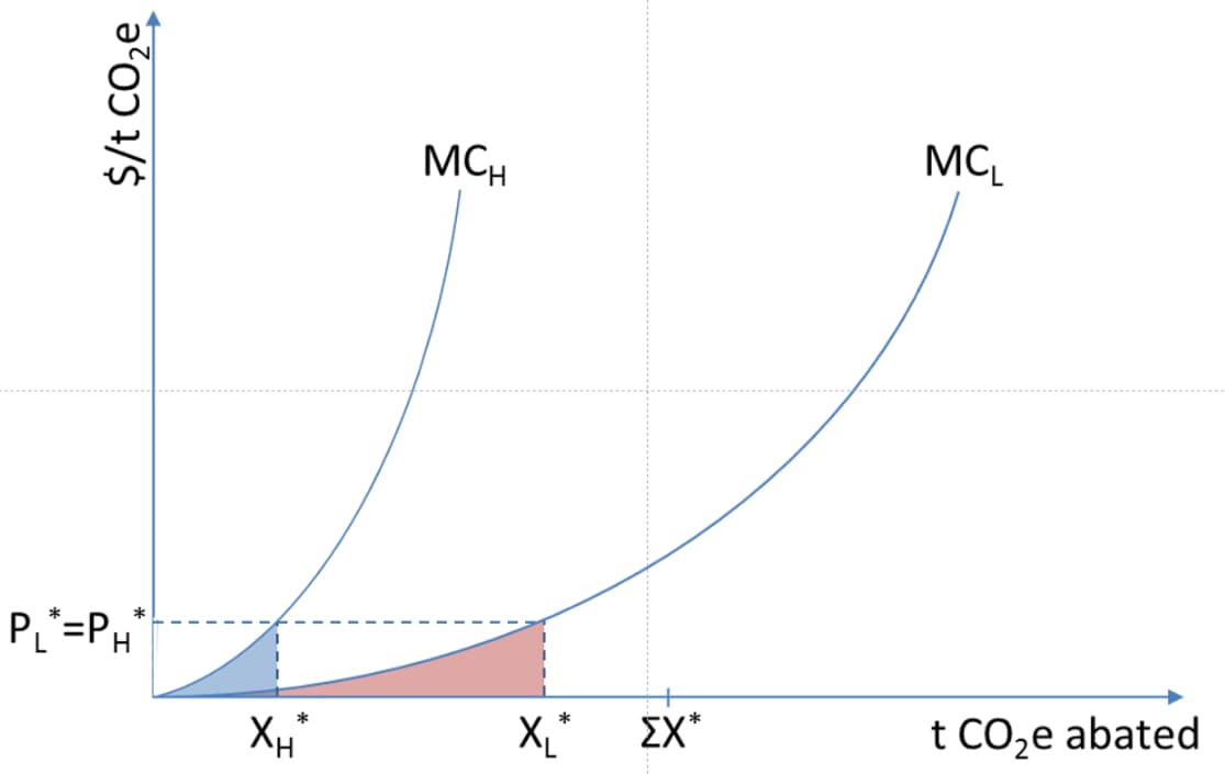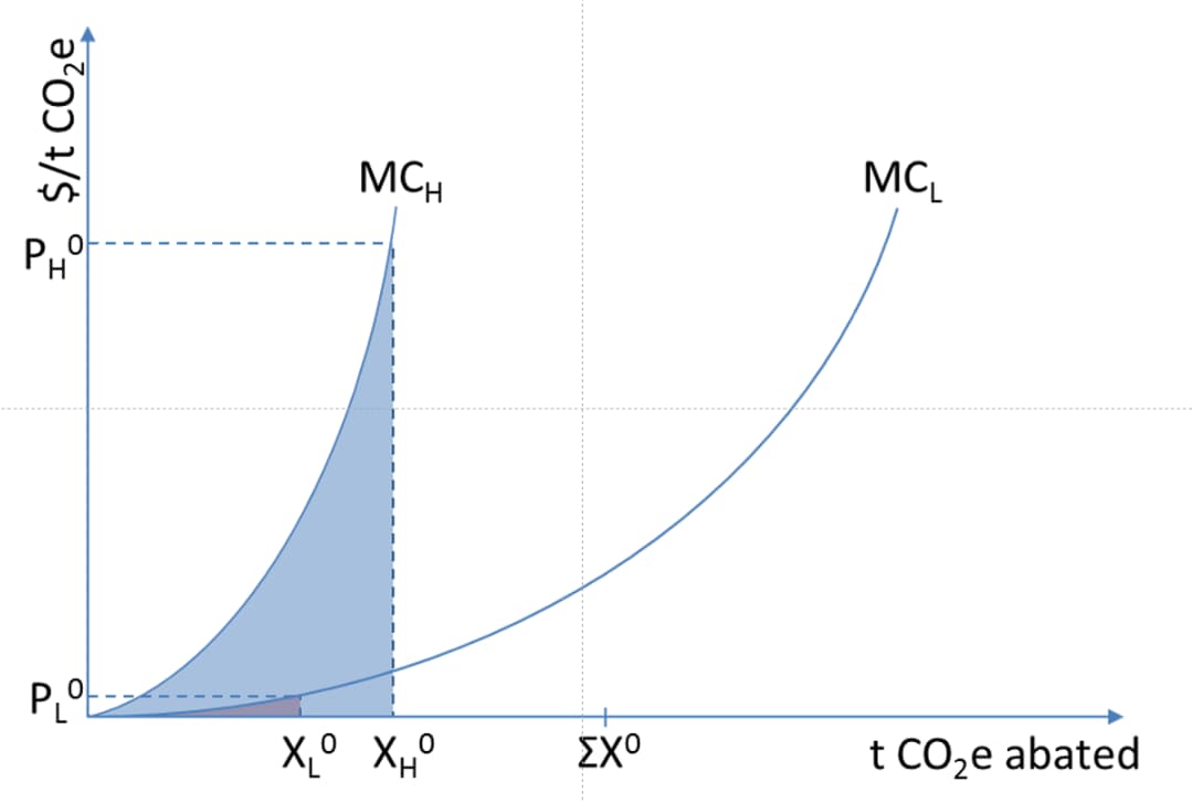 The textbook illustration of such savings is instructive. Take two jurisdictions, the high-cost abatement area (“H”) and the low-cost abatement area (“L”), with vastly different marginal costs (MC) of abatement. The total costs of abatement, the respective shaded areas in this graph, will be vastly different, too: