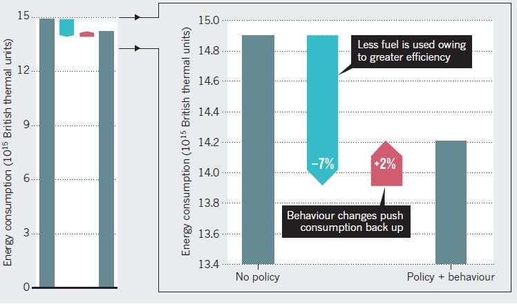 The rebound effect is real and should be considered in strategic energy planning. But it has become a distraction. A vast academic literature shows that rebounds are too small to derail energy-efficiency policies. Studies and simulations indicate that behavioural responses shave 5–30% off intended energy savings (see 'Bounce back'), reaching no more than 60% when combined with macroeconomic effects.