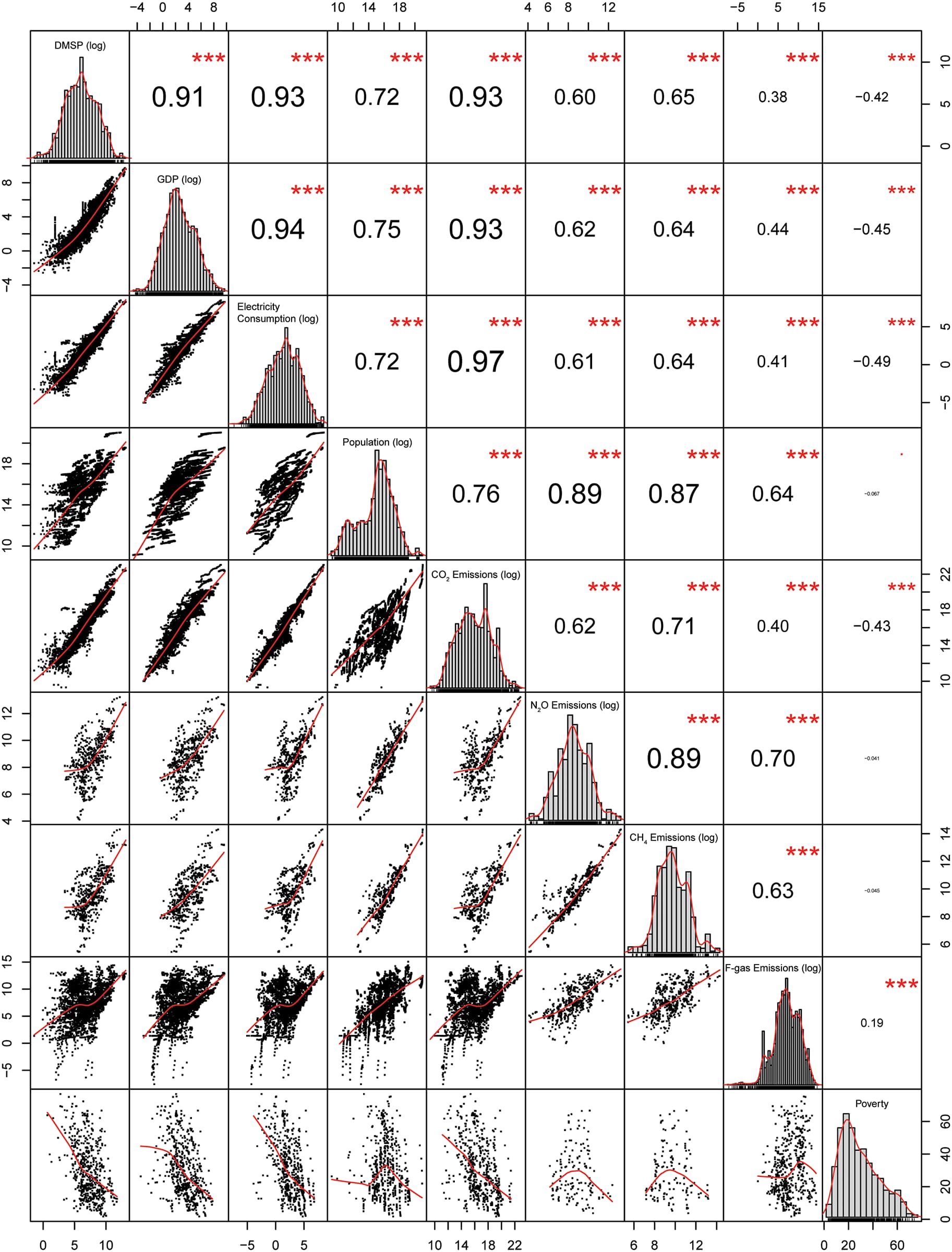 Fig 1. Correlation between area lit and a collection of socio-economic indicators.