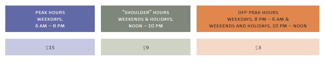 It’s shorthand for the dollars we propose to charge private cars to enter the congestion zone: $15 at peak times, which comprise weekdays, 6 am – 8 pm; $9 during “shoulder” hours, comprising weekends and holidays, noon – 10 pm; and $3 off-peak, comprising all other hours: weekdays, 8 pm – 6 am and weekends and holidays, 10 pm – noon. (Exemptions for tunnels to Manhattan, which are already tolled, are noted directly below.)