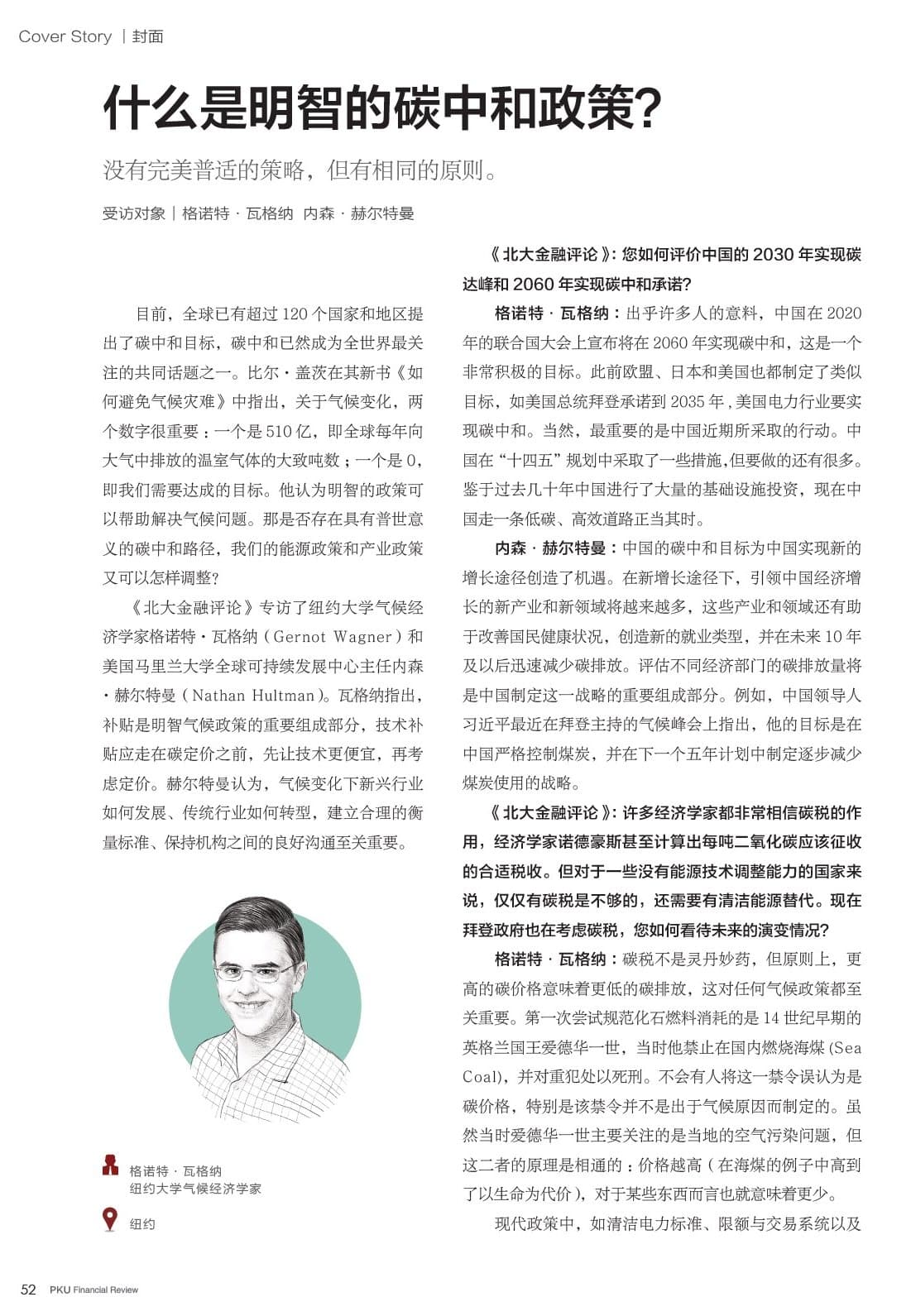 格诺特·瓦格纳:出乎许多人的意料,中国在2020 年的联合国大会上宣布将在2060 年实现碳中和,这是一个 非常积极的目标。此前欧盟、日本和美国也都制定了类似 目标,如美国总统拜登承诺到2035 年, 美国电力行业要实 现碳中和。当然,最重要的是中国近期所采取的行动。中 国在“十四五”规划中采取了一些措施,但要做的还有很多。鉴于过去几十年中国进行了大量的基础设施投资,现在中 国走一条低碳、高效道路正当其时。