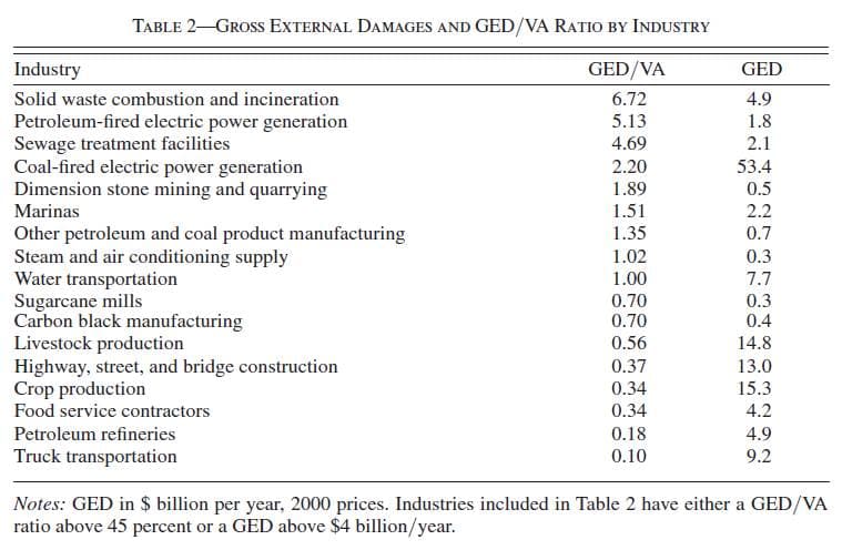 Now Nick Muller, Rob Mendelsohn, and Bill Nordhaus have done just that in practice. They also do a huge favor to all of us pollution gawkers out there and rank industries by the ratio of total damages they cause divided by how much value they add to the economy.