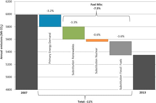 This paper introduces an approach for separately quantifying the contributions from renewables in decomposition analysis. So far, decomposition analyses of the drivers of national CO2 emissions have typically considered the combined energy mix as an explanatory factor without an explicit consideration or separation of renewables. As the cost of renewables continues to decrease, it becomes increasingly relevant to track their role in CO2 emission trends. Index decomposition analysis, in particular, provides a simple approach for doing so using publicly available data. We look to the U.S. as a case study, highlighting differences with the more detailed but also more complex structural decomposition analysis. Between 2007 and 2013, U.S. CO2 emissions decreased by around 10%—a decline not seen since the oil crisis of 1979. Prior analyses have identified the shale gas boom and the economic recession as the main explanatory factors. However, by decomposing the fuel mix effect, we conclude that renewables played an equally important role as natural gas in reducing CO2 emissions between 2007 and 2013: renewables decreased total emissions by 2.3–3.3%, roughly matching the 2.5–3.6% contribution from the shift to natural gas, compared with 0.6–1.5% for nuclear energy.