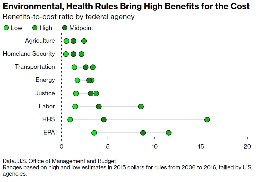 The areas of health and the environment, meanwhile, have a lot more potential for rules and regulations that would provide ample benefits: climate and clean air rules, or public health provisions. High benefit-cost ratios, therefore, aren’t necessarily a good sign. They show how much further we have to go, and that the U.S. government is simply not doing enough on that front.