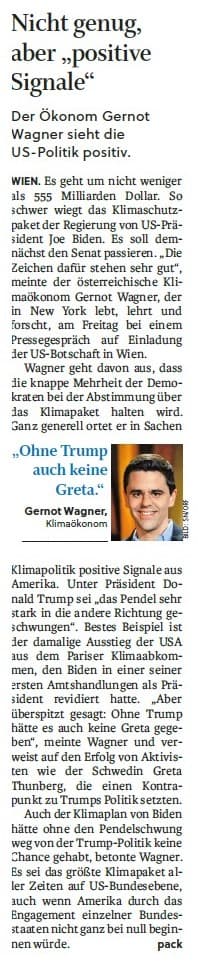 revidiert hatte. „Aber überspitzt gesagt: Ohne Trump hätte es auch keine Greta gegeben“, meinte Wagner und verweist auf den Erfolg von Aktivisten wie der Schwedin Greta Thunberg, die einen Kontrapunkt zu Trumps Politik setzten.Auch der Klimaplan von Biden hätte ohne den Pendelschwung weg von der Trump-Politik keine Chance gehabt, betonte Wagner. Es sei das größte Klimapaket aller Zeiten auf US-Bundesebene, auch wenn Amerika durch das Engagement einzelner Bundesstaaten nicht ganz bei null beginnen würde.